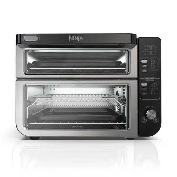 Meet the Ninja Double Oven, the countertop oven that unlocks the power of two ovens in the counter space of one. Only Ninja has the FlexDoor that creates 2 separate ovens so you can cook 2 meals, 2 ways at different temperatures and cooking times. Sync both independent ovens to cook a full course meal that finishes cooking at the same time with Smart Finish technology. While your meal cooks, Technology prevents flavor crossover between ovens.