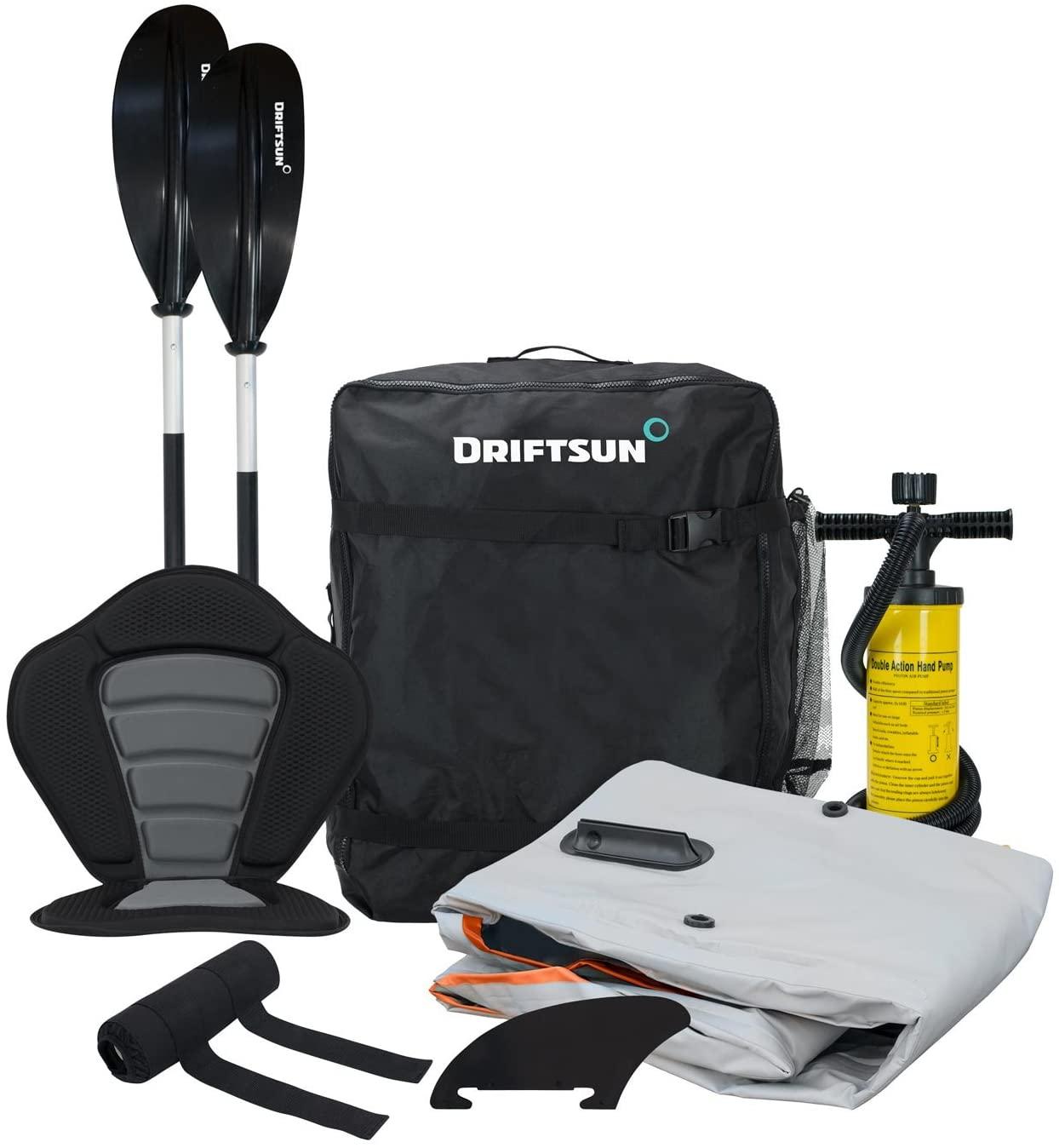• Included Adjustable EVA Padded Seat with High Back Support, Adjustable 2-Piece Aluminum Kayak Paddle, Deluxe Double Action Hand Pump, Rear Tracking Fin, and Travel Bag.